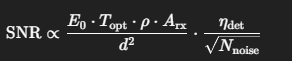 SNR: launch energy, path losses, reflectivity ρ\rhoρ, detector QE, and ambient background.